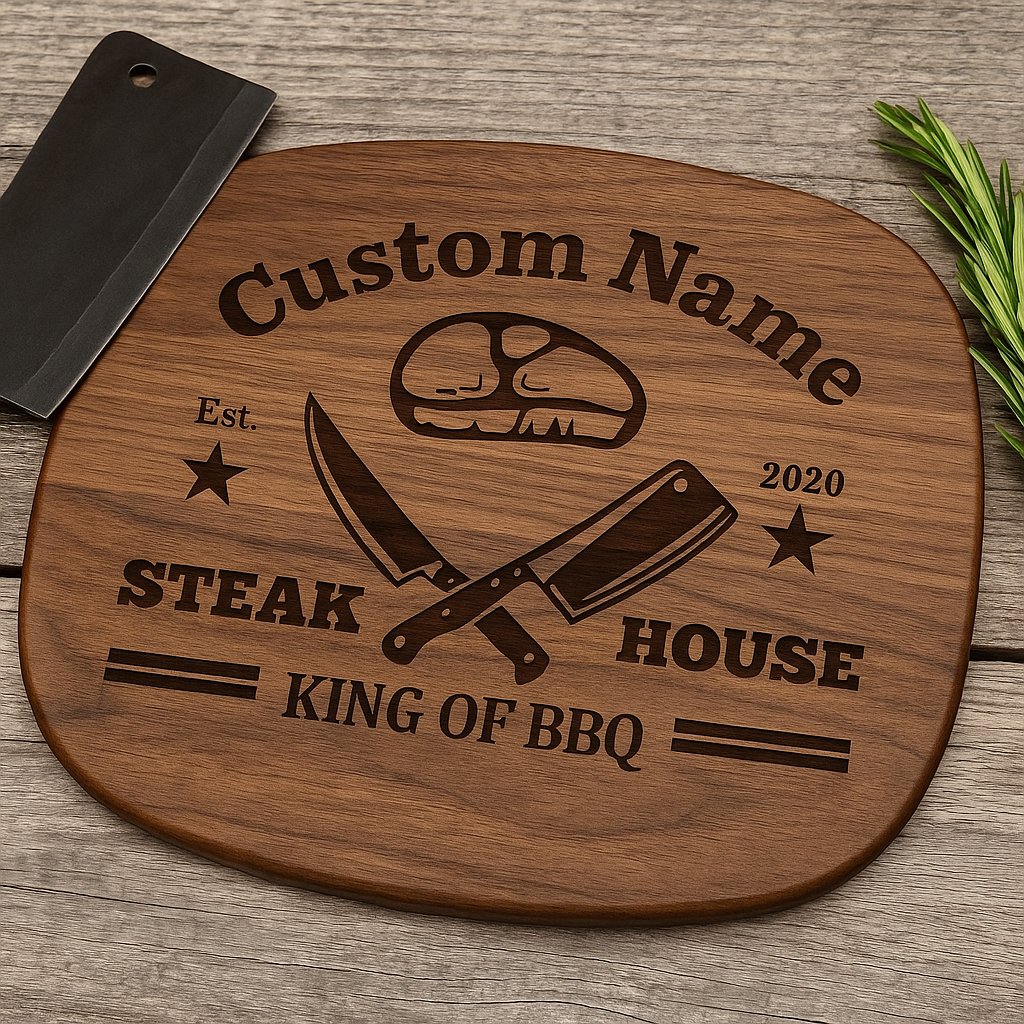 Custom engraved steakhouse cutting boards for the true BBQ master. Add your name and make it yours!