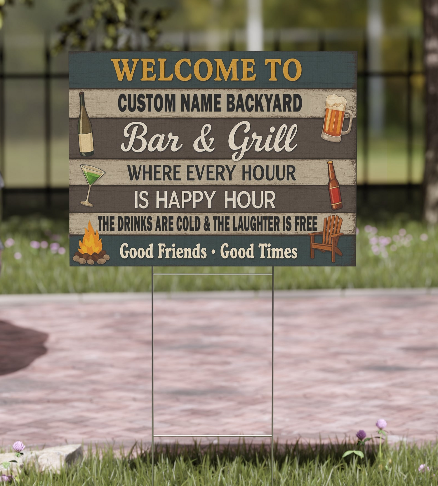 Personalized Bar & Grill Signs that bring good vibes, cold drinks, and great memories. Custom name included — because your backyard deserves its own brand.