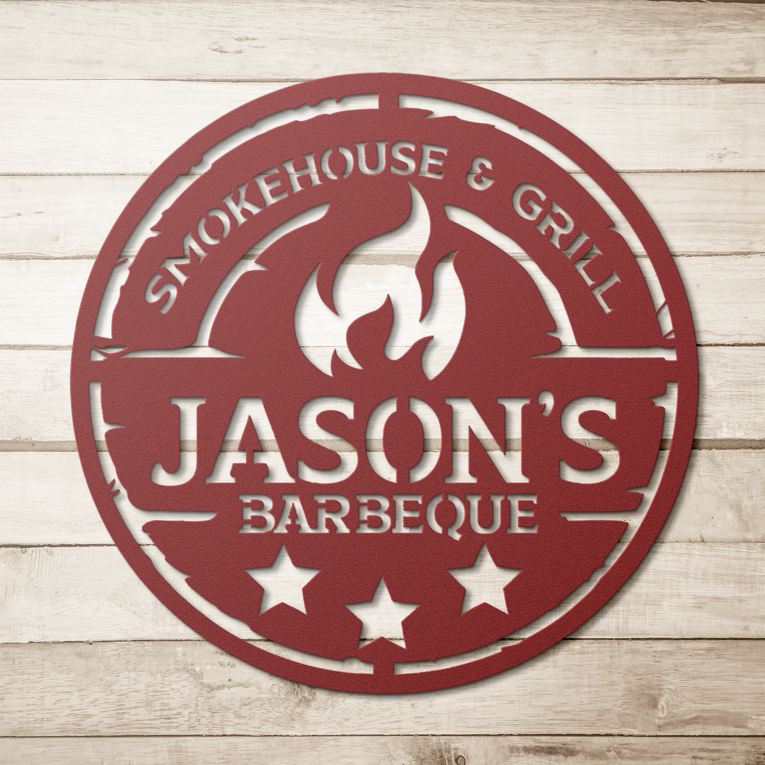 Personalize your grill zone with this bold metal sign. Made from heavy-duty steel and built to impress inside or out — your name, your fire, your rules.