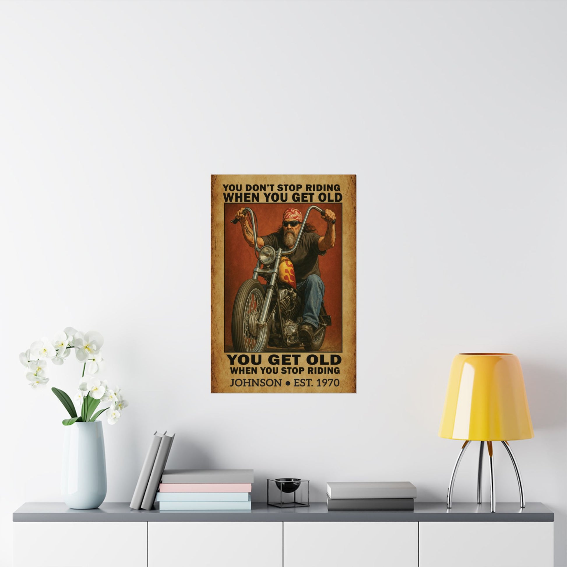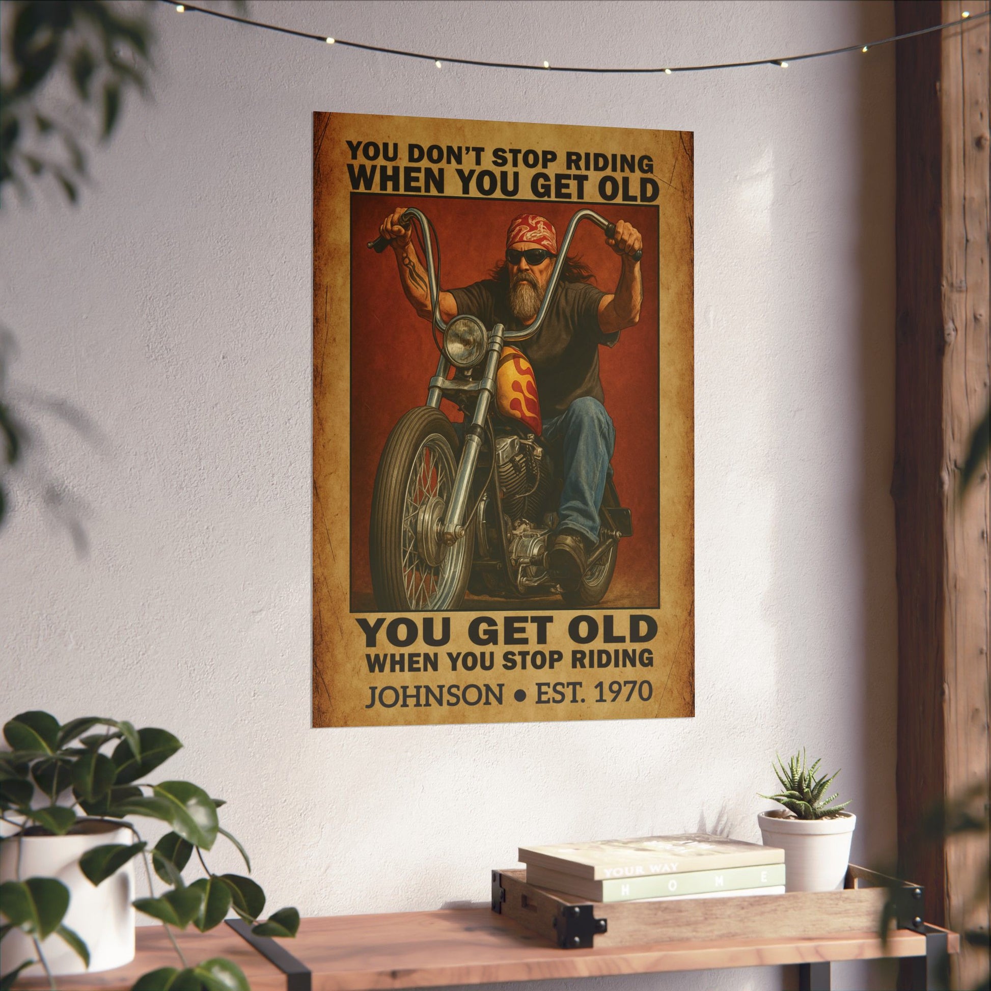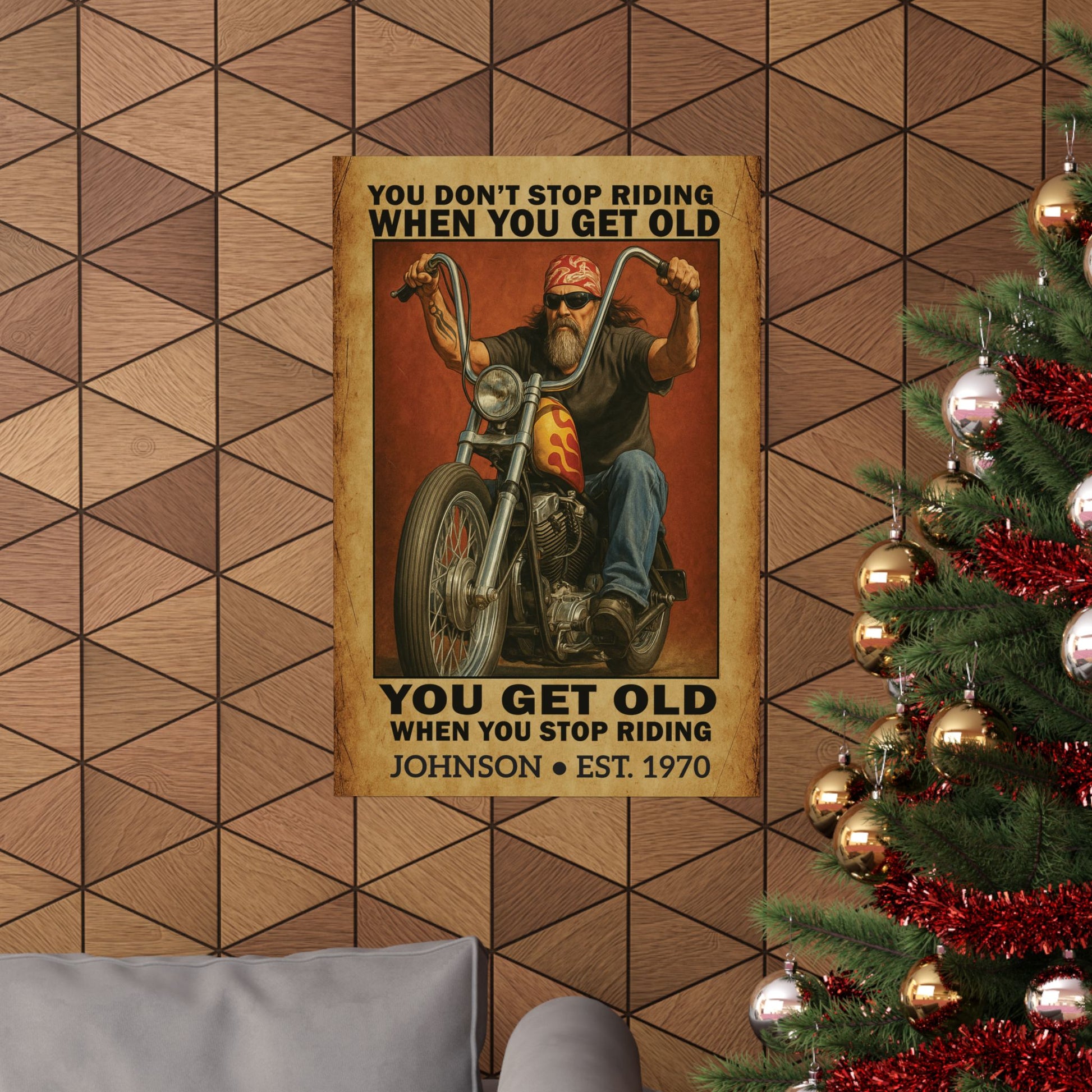 Custom Vintage Biker Poster – "You Don’t Stop Riding" – Personalized Wall Art