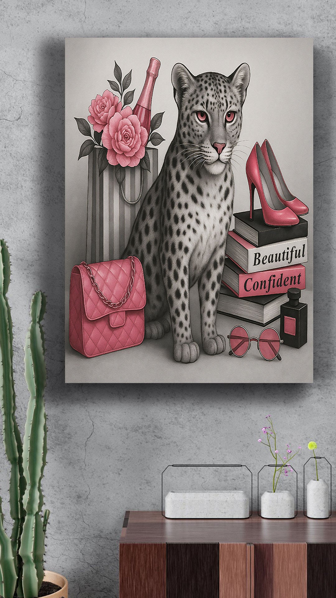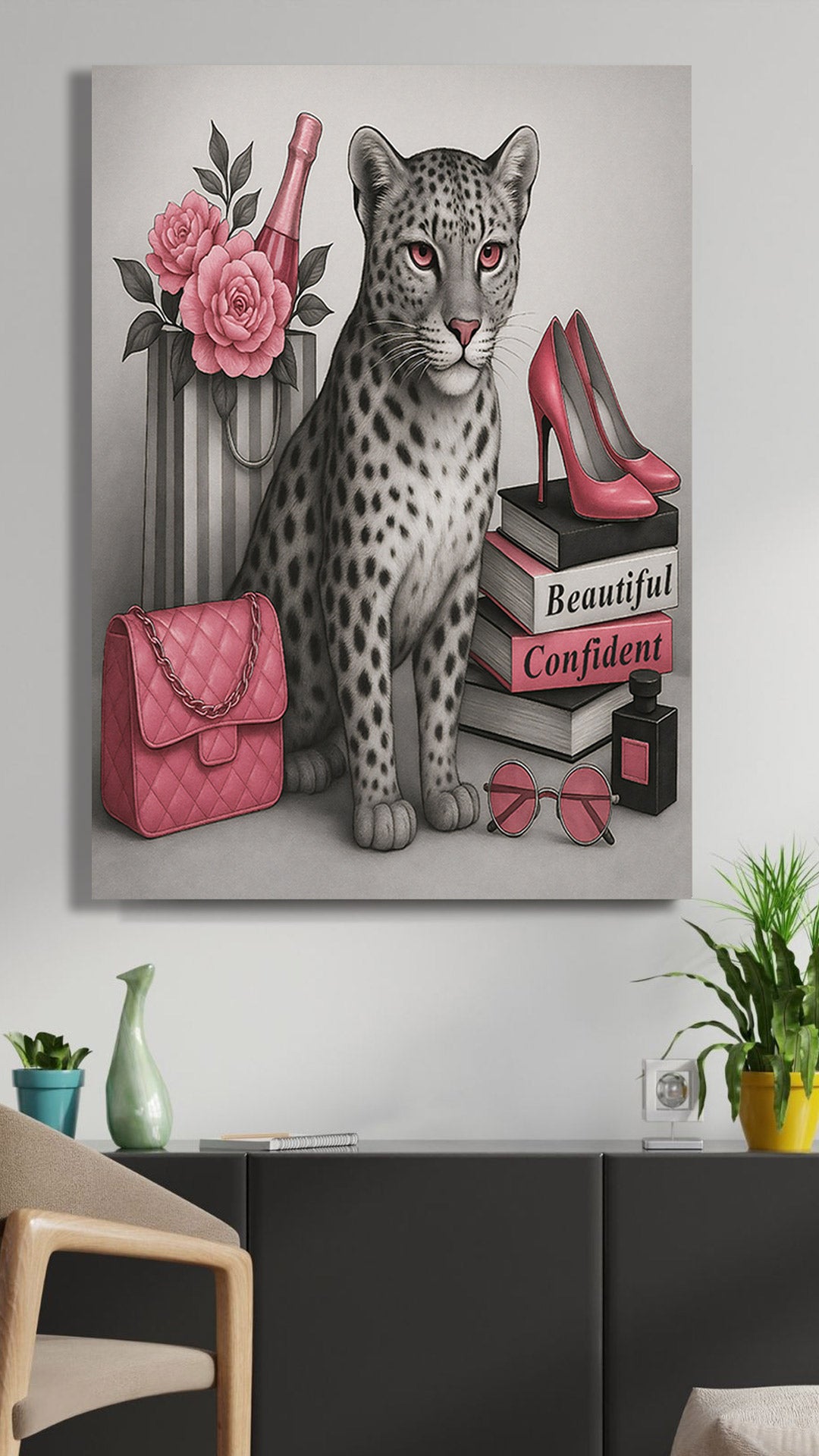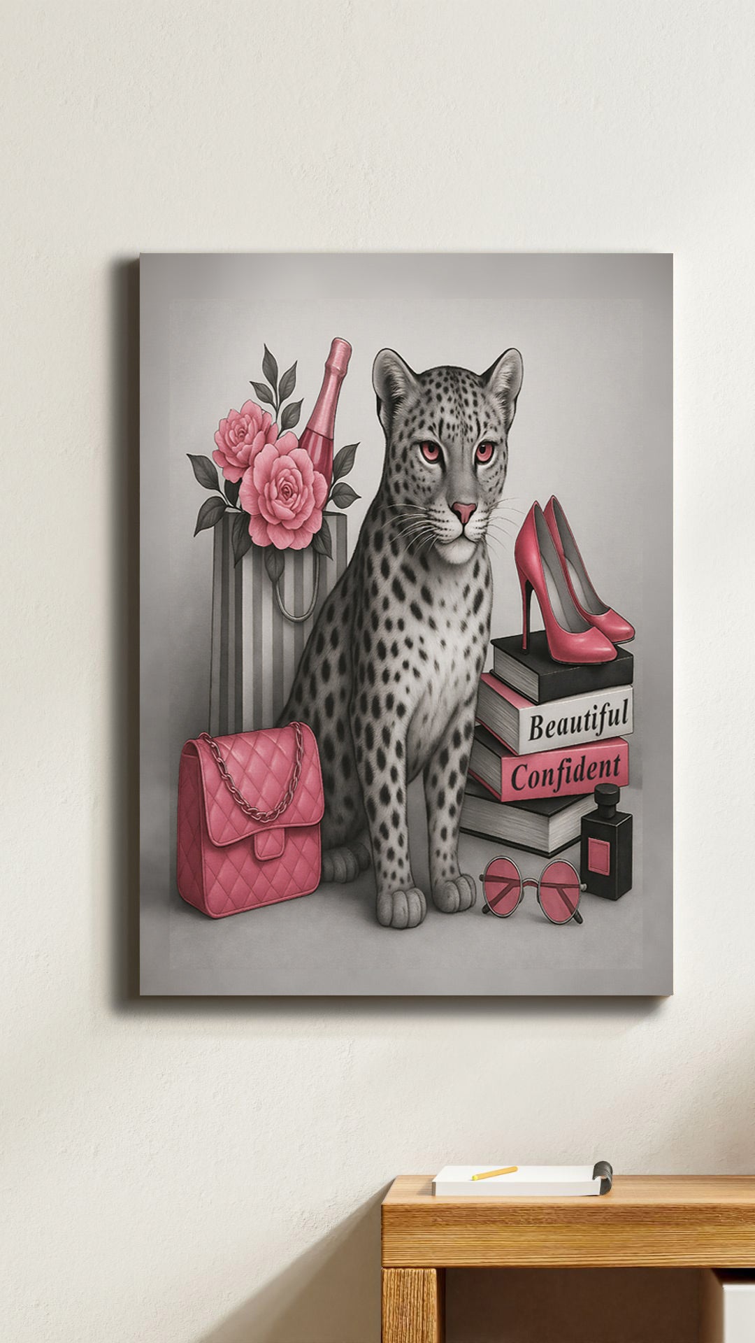 Turn your wall into a fashion statement with this bold 16" x 20" gallery-wrapped canvas - featuring a confident leopard, luxe glam essentials, and vibrant pink tones that own the room.