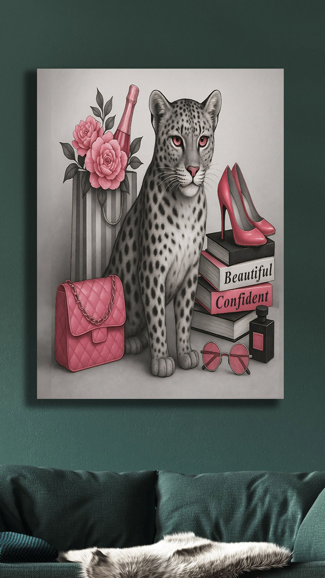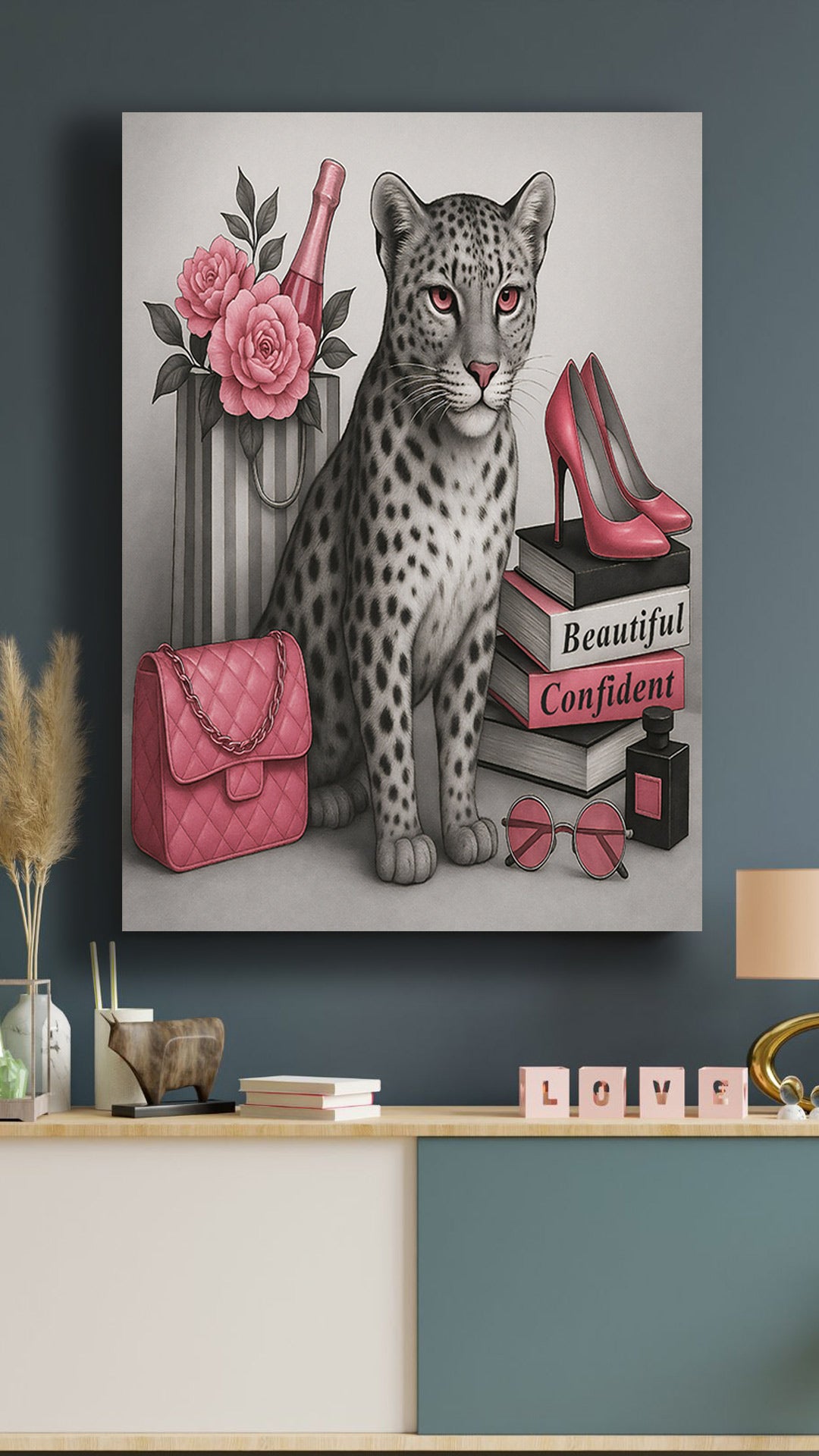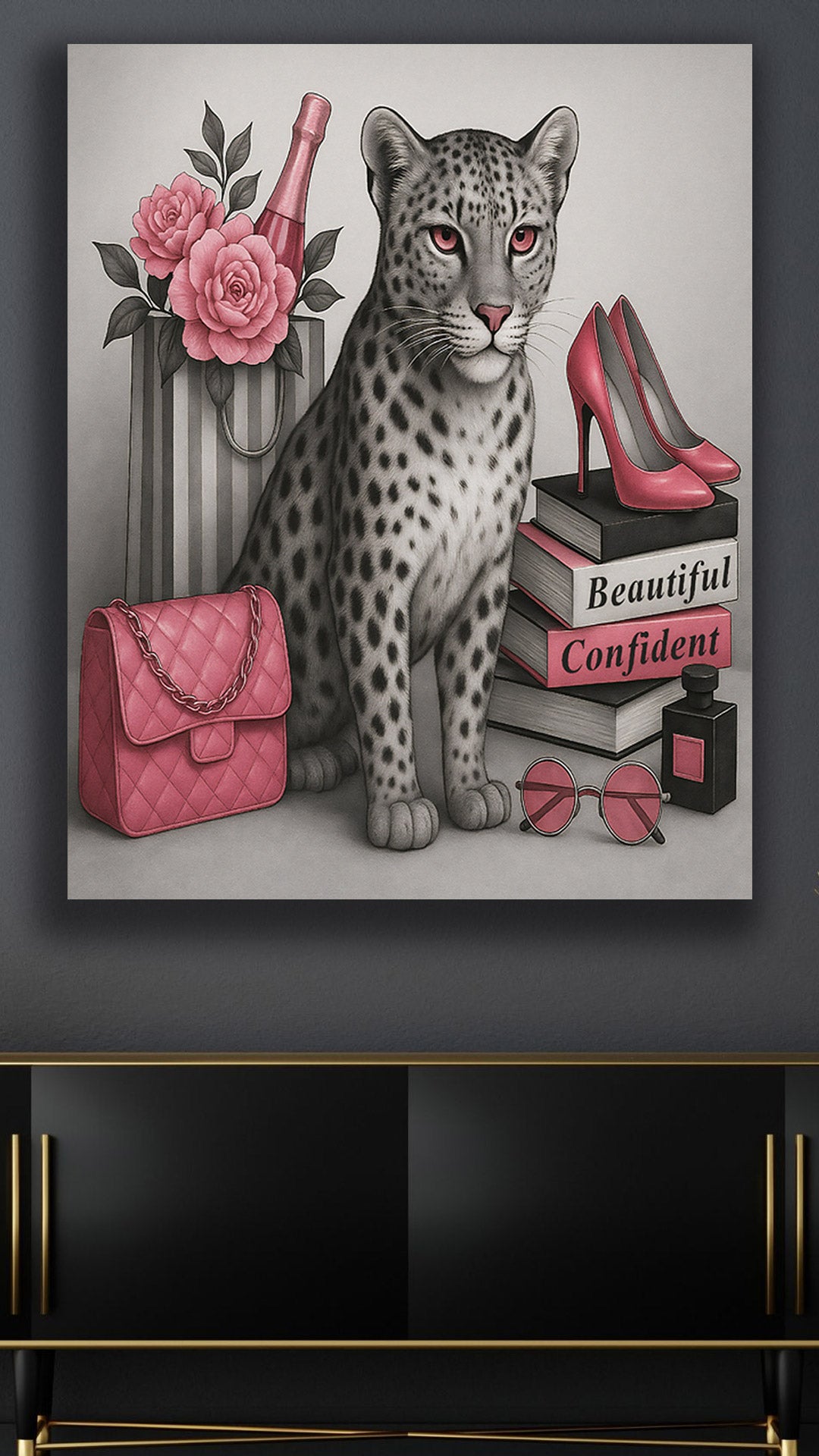 Turn your wall into a fashion statement with this bold 16" x 20" gallery-wrapped canvas - featuring a confident leopard, luxe glam essentials, and vibrant pink tones that own the room.