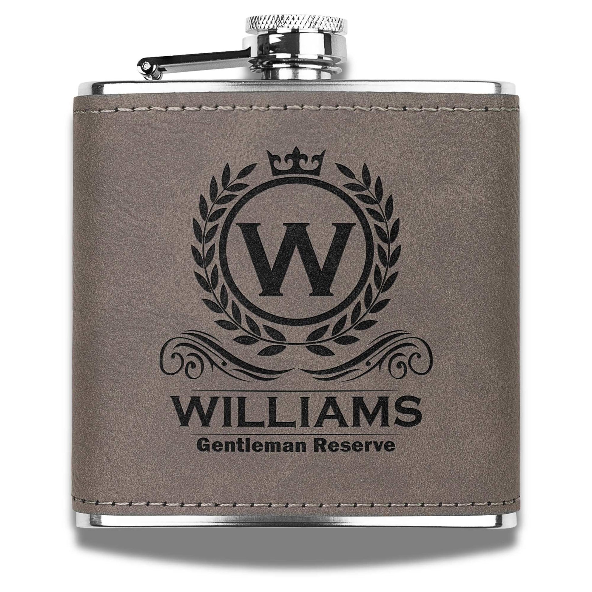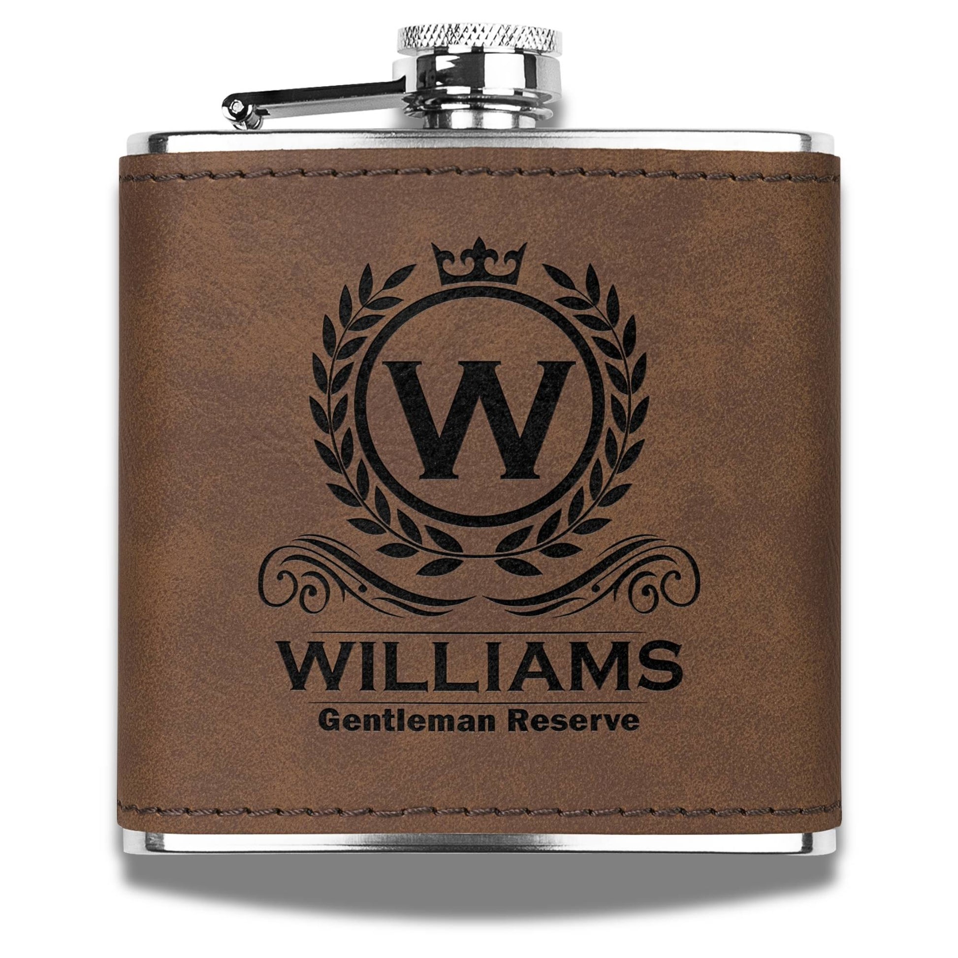 Meet the 6oz flask made for refined moments and bold personalities. Wrapped in premium leatherette and laser-engraved with your custom name and our “Gentleman Reserve” design, it’s more than just a flask — it’s a personal statement.