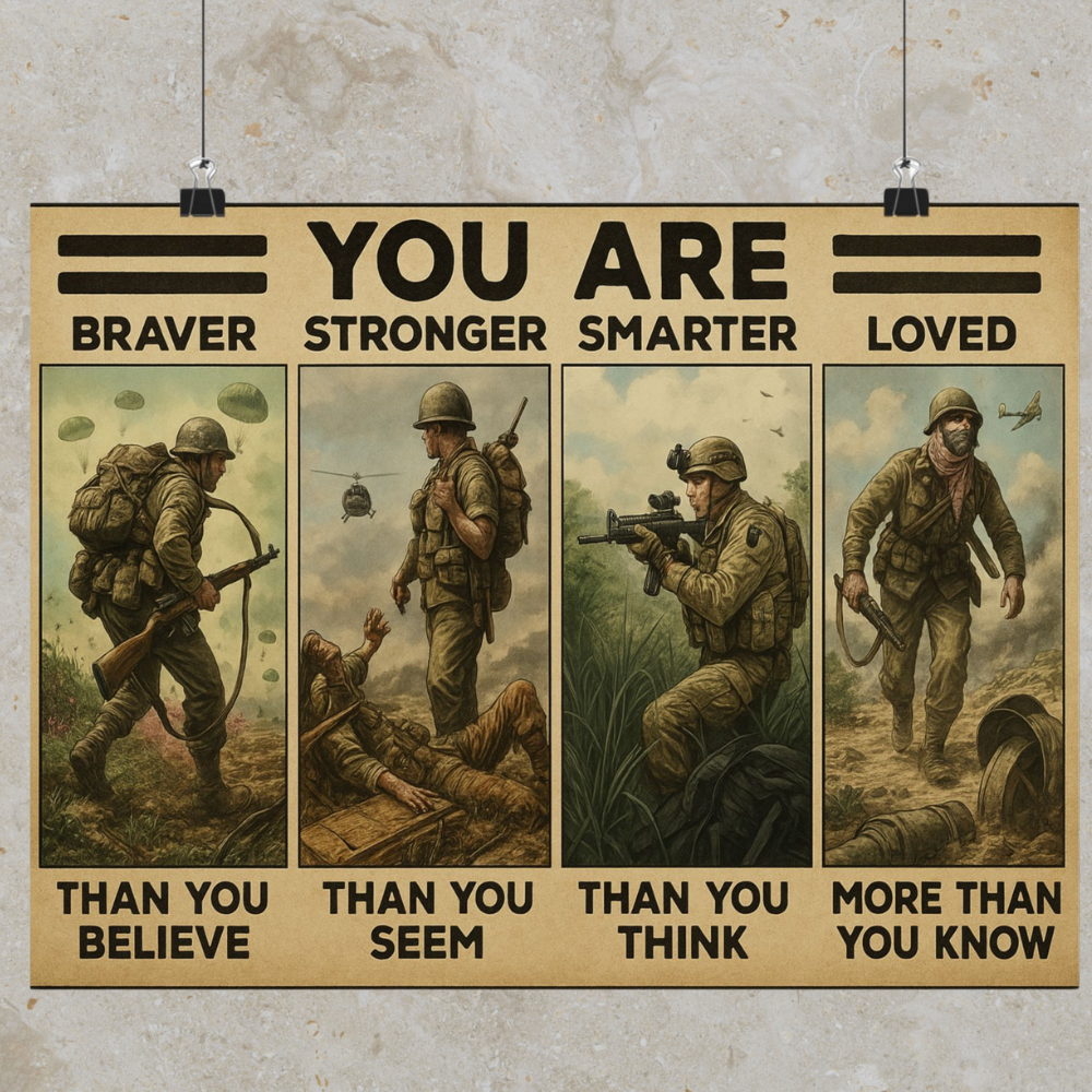 This horizontal matte poster is more than just wall decor — it’s a tribute to the inner strength of those who serve, support, and stand tall. With bold, vintage-style military illustrations and empowering affirmations, it’s the kind of artwork that speaks directly to the heart.