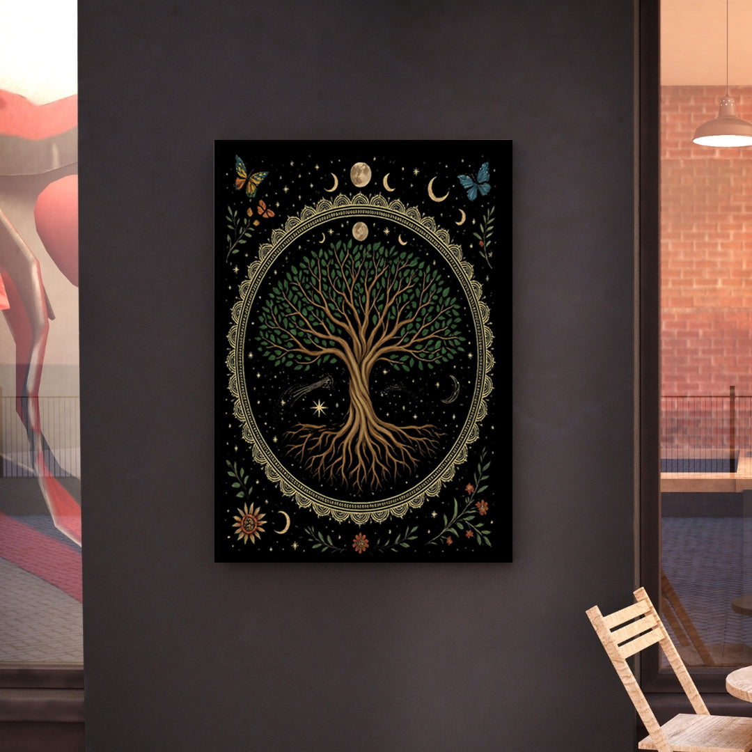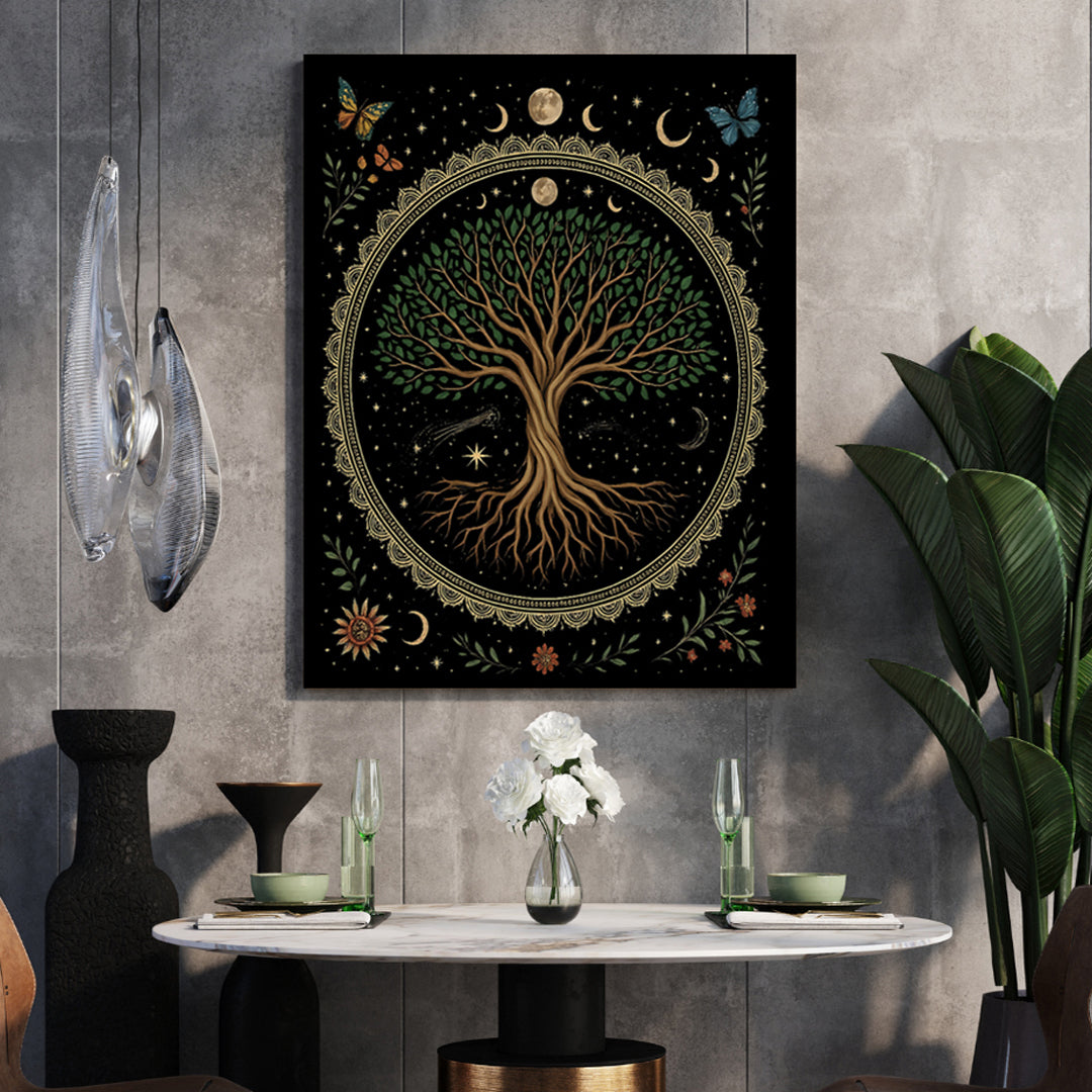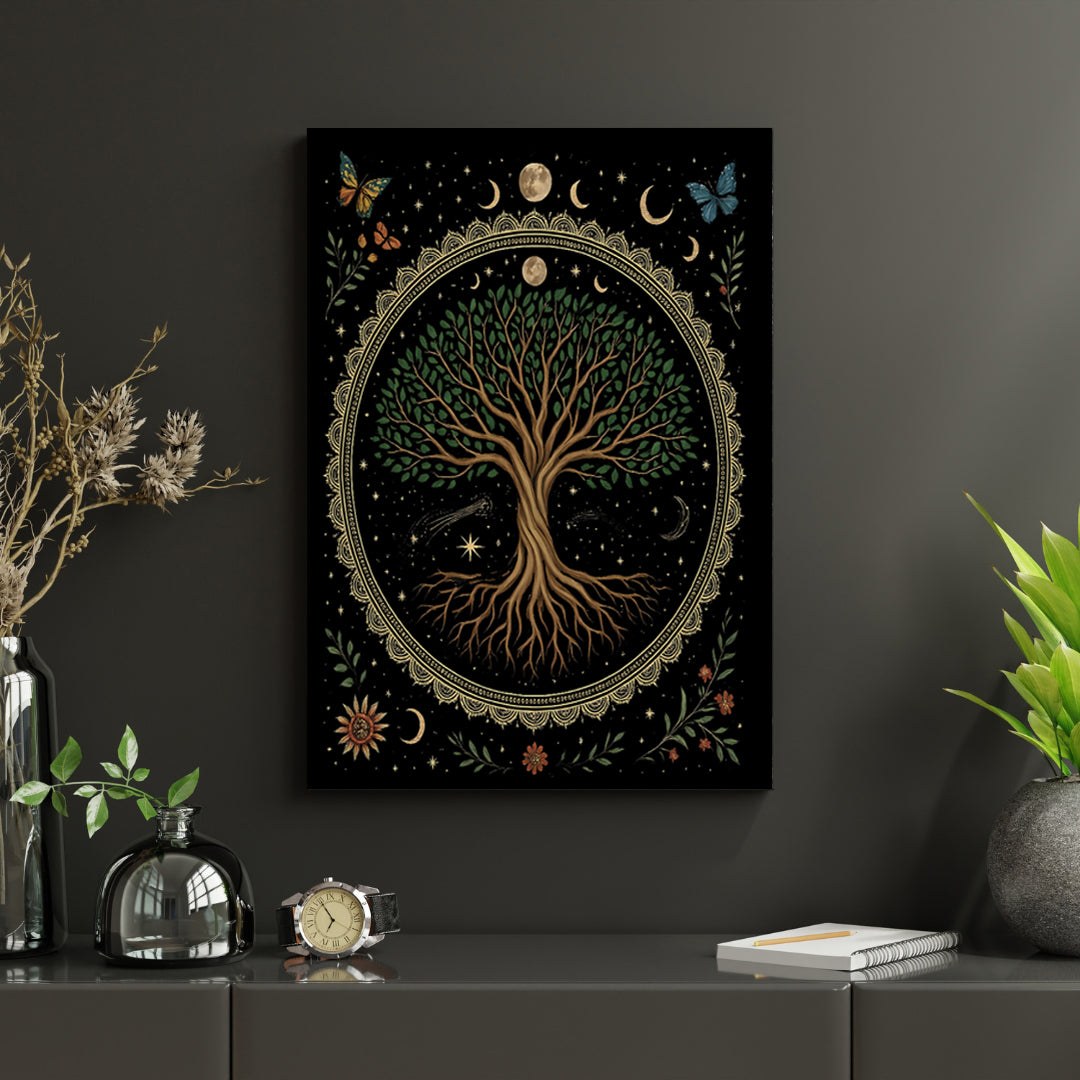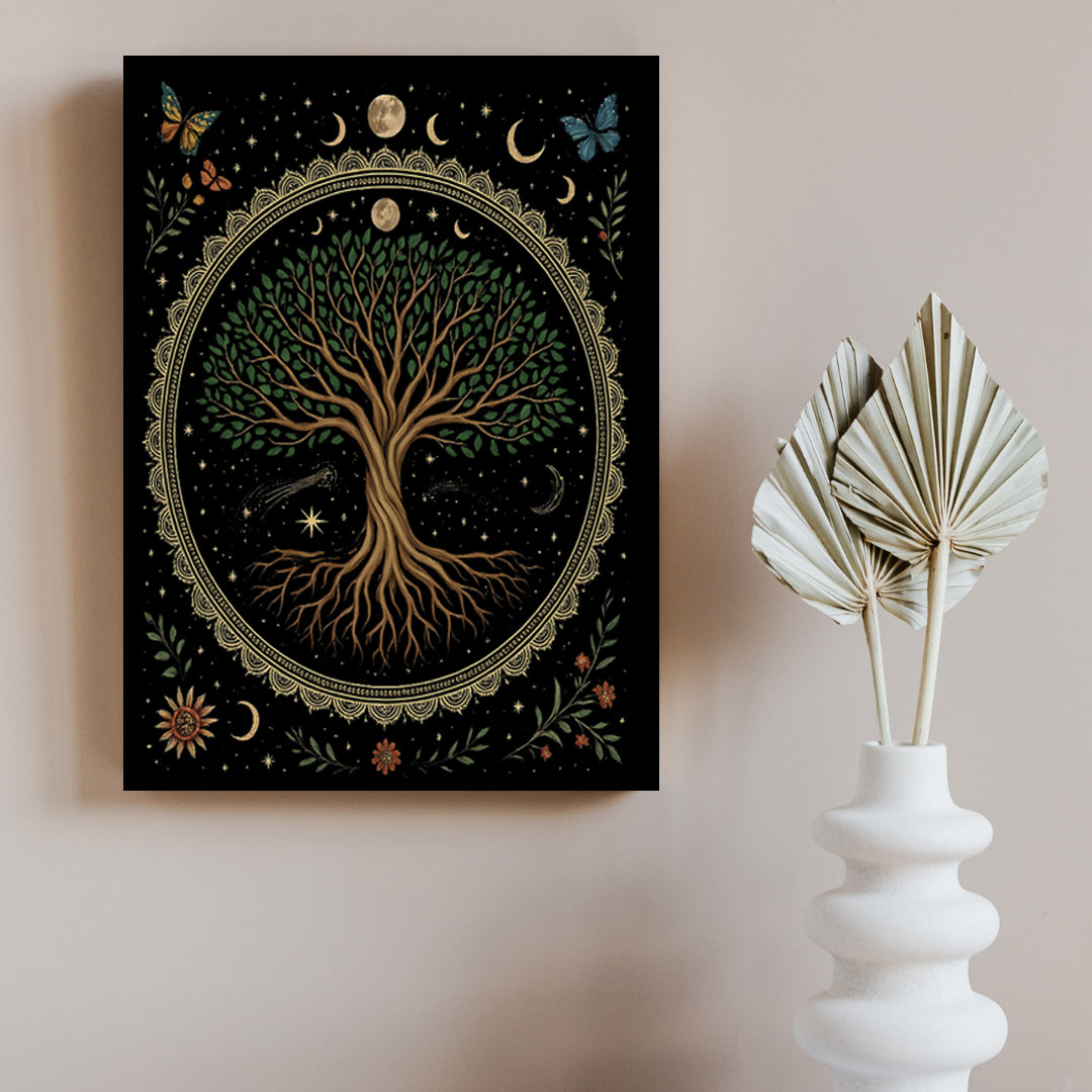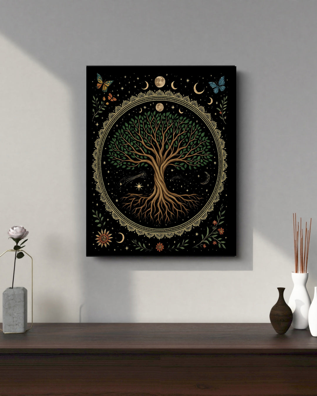 This 16" x 20" Premium canvas brings the sacred Tree of Life into your space — a symbol of strength, growth, and universal connection. Surrounded by moons, stars, and celestial blooms, this design grounds your soul while lifting your spirit.