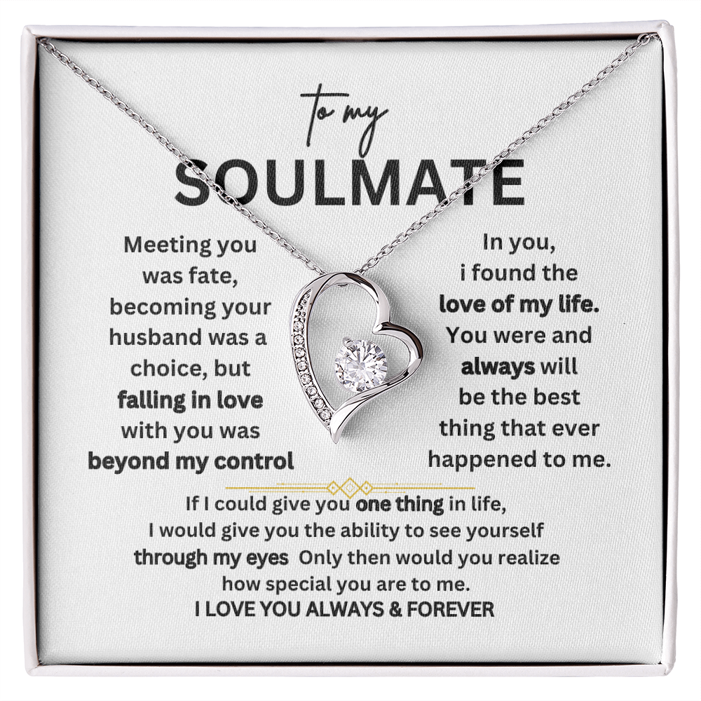 "TO MY SOULMATE – Meeting you was fate, becoming your husband was a choice, but falling in love with you was beyond my control. In you, I found the love of my life. You were and always will be the best thing that ever happened to me. If I could give you one thing in life, I would give you the ability to see yourself through my eyes. Only then would you realize how special you are to me. I LOVE YOU ALWAYS & FOREVER."