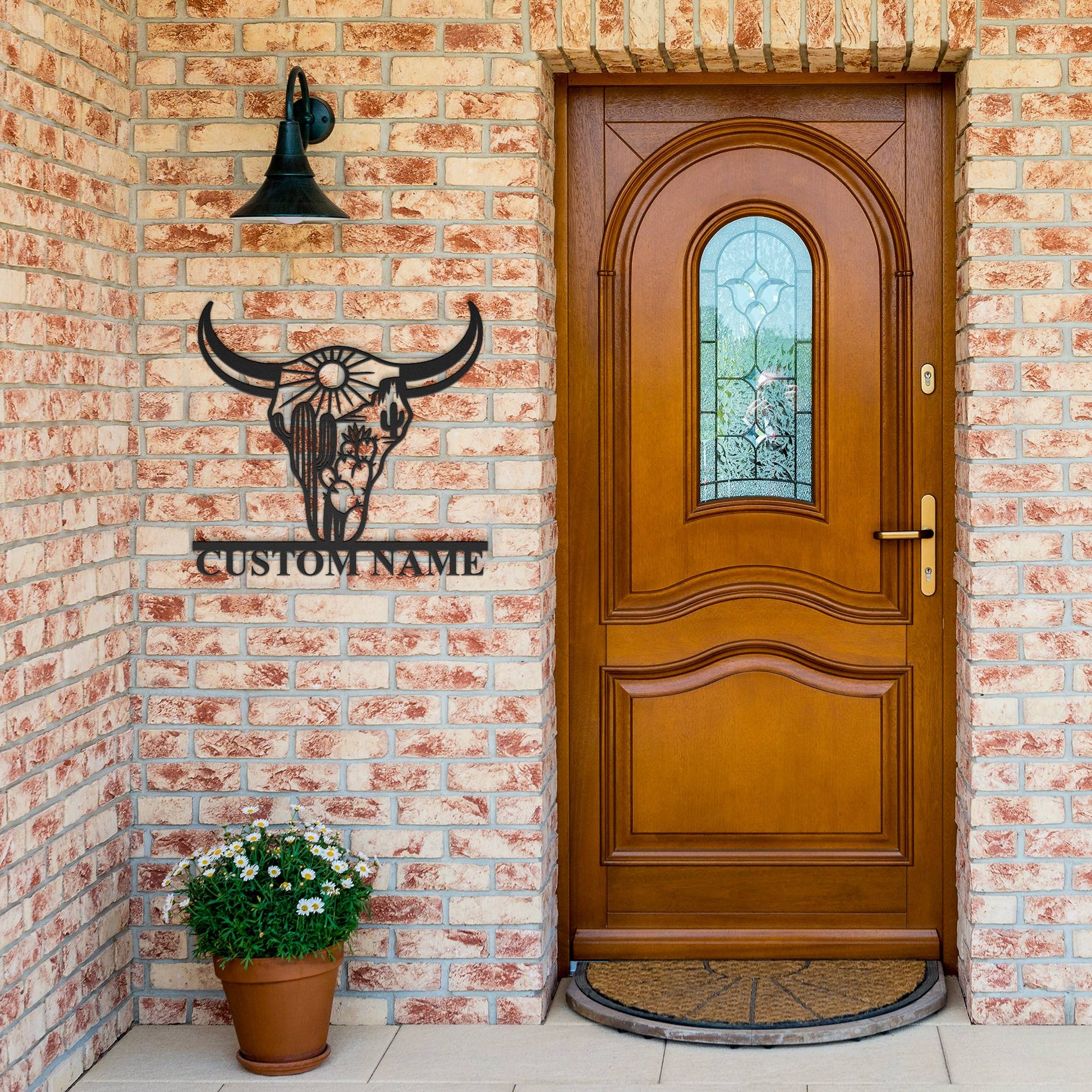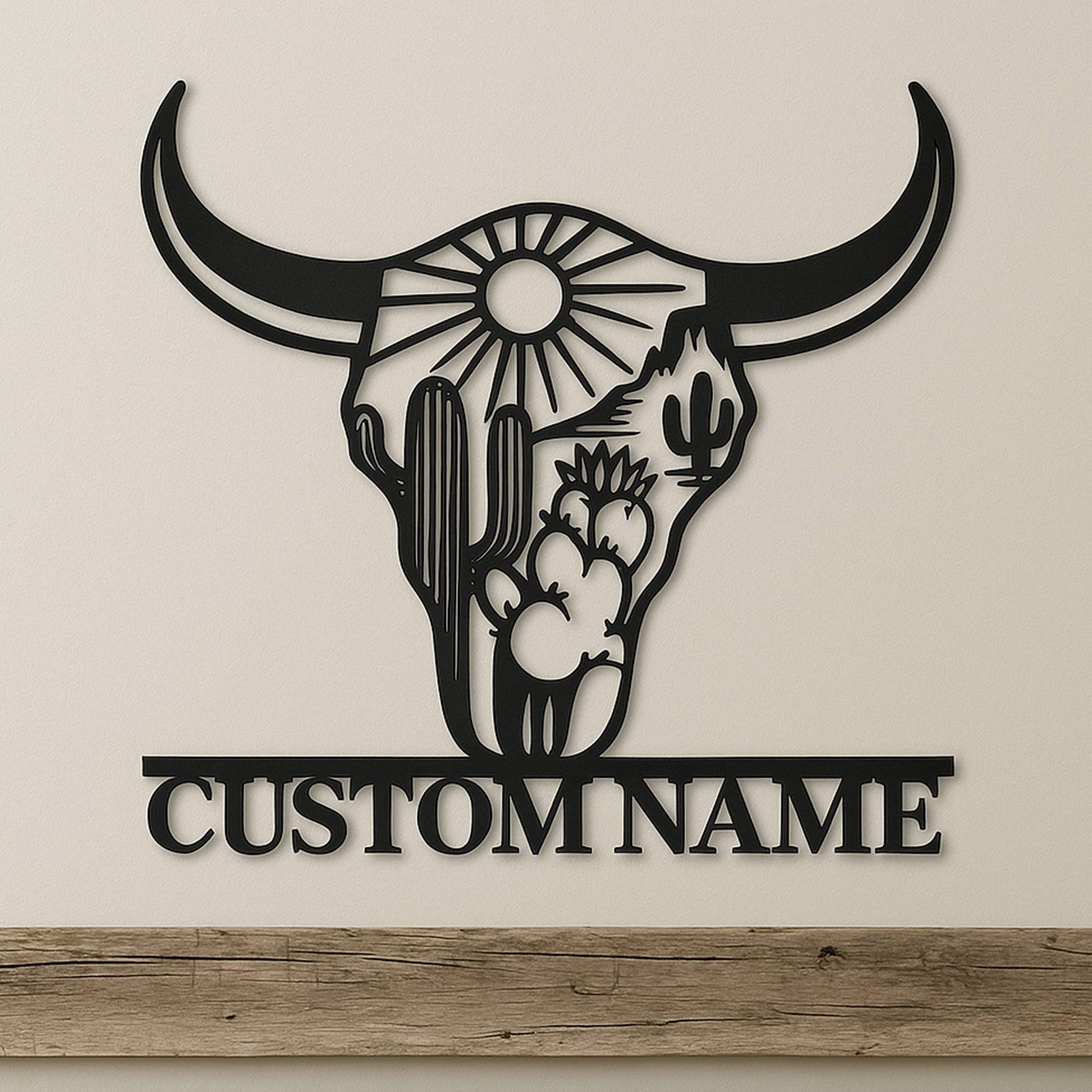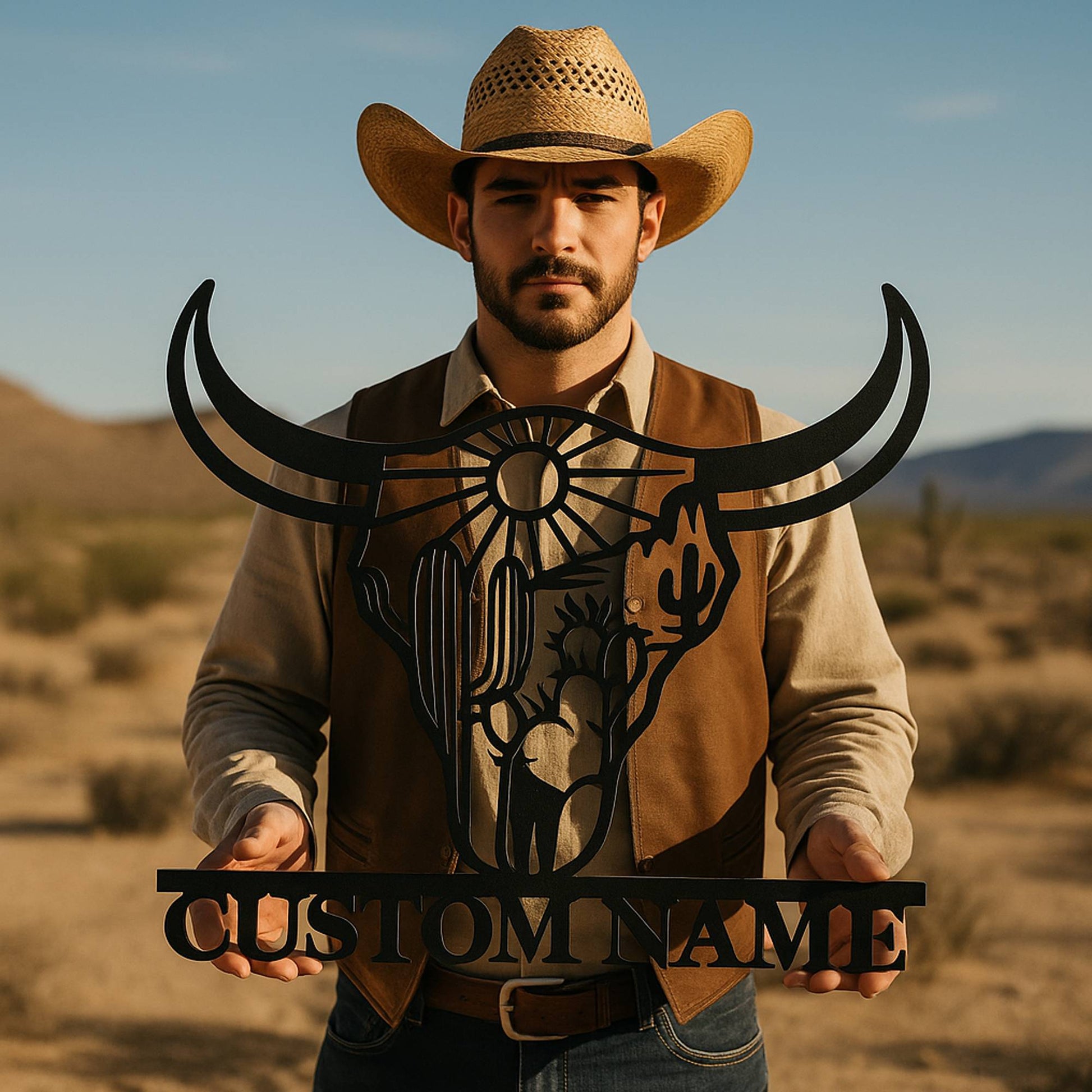 Bring bold Western charm to your space with this personalized Longhorn Skull Metal Sign , the perfect statement piece for cowboy homes, rustic porches, or country-style entryways.
